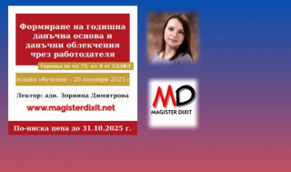 20 ноември 2025 Online ФОРМИРАНЕ НА ГОДИШНА ДАНЪЧНА ОСНОВА ЗА ДОХОДИТЕ ОТ ТРУДОВИ ПРАВООТНОШЕНИЯ. ПОЛЗВАНЕ НА ДАНЪЧНИ ОБЛЕКЧЕНИЯ ЧРЕЗ РАБОТОДАТЕЛЯ. ПОПЪЛВАНЕ НА СПРАВКАТА ПО ЧЛ. 73, АЛ. 6 ОТ ЗДДФЛ. -