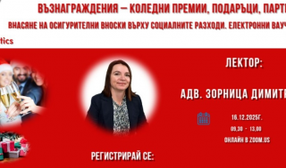 16 декември 2025 Online ВНАСЯНЕ НА ОСИГУРИТЕЛНИ ВНОСКИ ВЪРХУ ДОПЪЛНИТЕЛНИ ВЪЗНАГРАЖДЕНИЯ – КОЛЕДНИ ПРЕМИИ, ПОДАРЪЦИ, ПАРТИТА. ВНАСЯНЕ НА ОСИГУРИТЕЛНИ ВНОСКИ ВЪРХУ СОЦИАЛНИТЕ РАЗХОДИ ПРЕДОСТАВЯНЕ НА ЕЛЕКТРОННИ ВАУЧЕРИ ЗА ХРАНА -