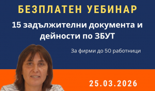 Приключило 25 март 2026 Online Безплатен уебинар „ЗБУТ за фирми до 50 работници“ -