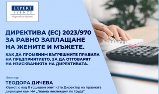 27 април 2026 Online ОНЛАЙН СЕМИНАР: „ДИРЕКТИВА (ЕС) 2023/970 ЗА РАВНО ЗАПЛАЩАНЕ НА ЖЕНИТЕ И МЪЖЕТЕ. КАК ДА ПРОМЕНИМ ВЪТРЕШНИТЕ ПРАВИЛА НА ПРЕДПРИЯТИЕТО, ЗА ДА ОТГОВАРЯТ НА ИЗИСКВАНИЯТА НА ДИРЕКТИВАТА“ -