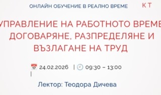 24 февруари 2026 Online УПРАВЛЕНИЕ НА РАБОТНОТО ВРЕМЕ. ДОГОВАРЯНЕ, РАЗПРЕДЕЛЯНЕ И ВЪЗЛАГАНЕ НА ТРУД -