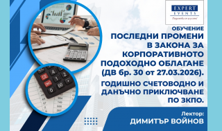 15 юни 2026 Online Онлайн семинар: „Последни промени в Закона за корпоративното подоходно облагане (ДВ, бр. 30 от 27.03.2026 г.). Годишно счетоводно и данъчно приключване по ЗКПО“ -